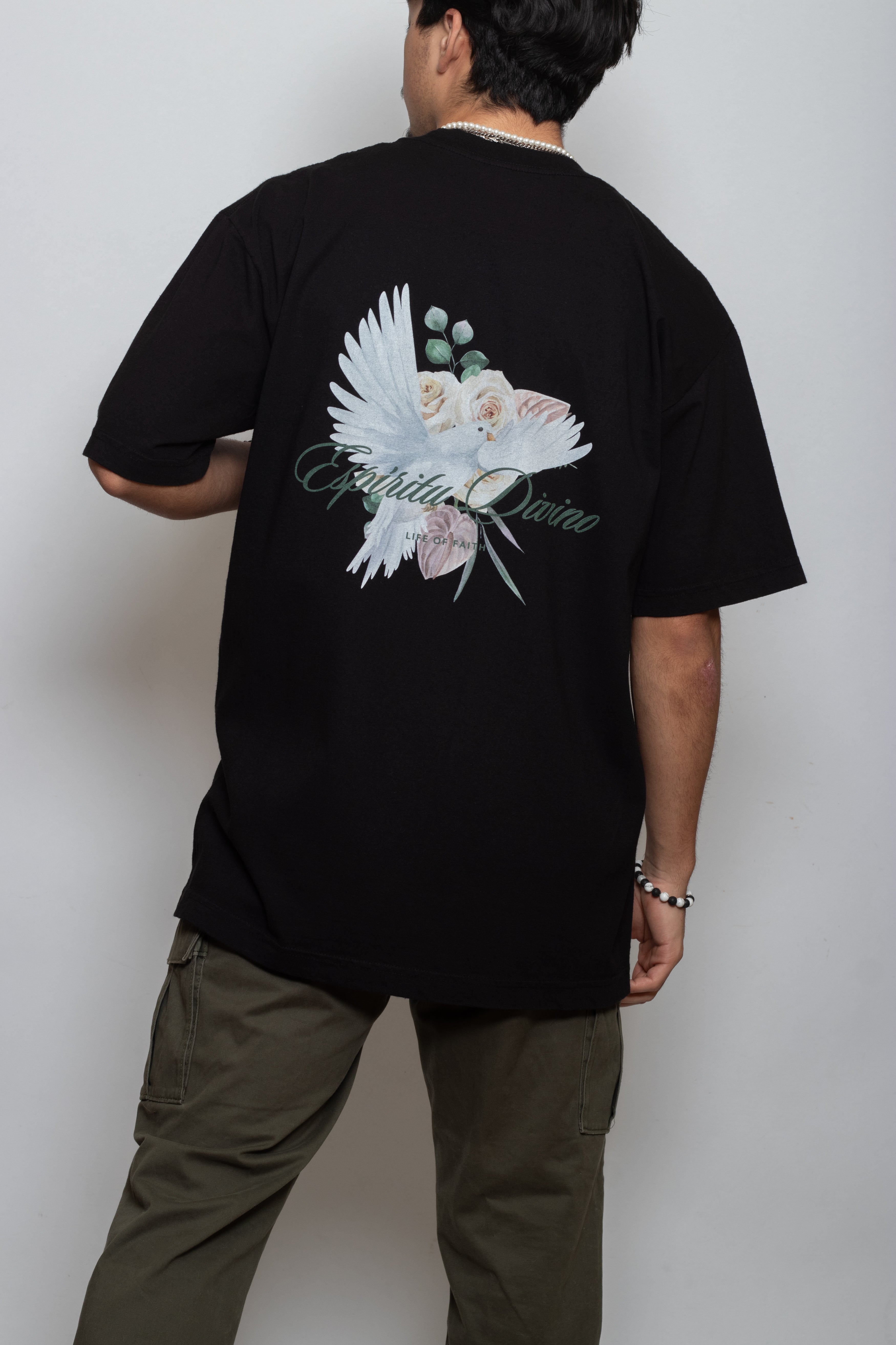 This tee is inspired by the hispanic translation for Holy Spirit, known as "el Espiritu Divino." Within the Bible the Holy Spirit is represented as a dove that descends upon us with God's grace. Made from heavyweight cotton, this is a high quality drop shoulder tee that offers the best oversized look for you.